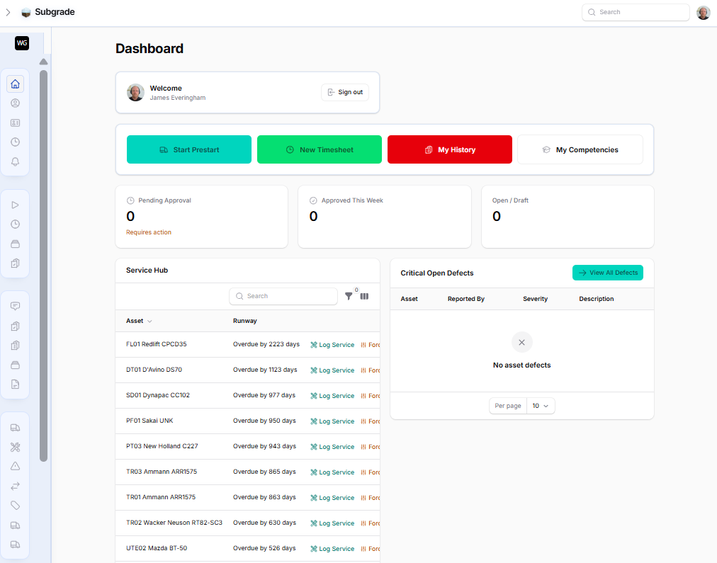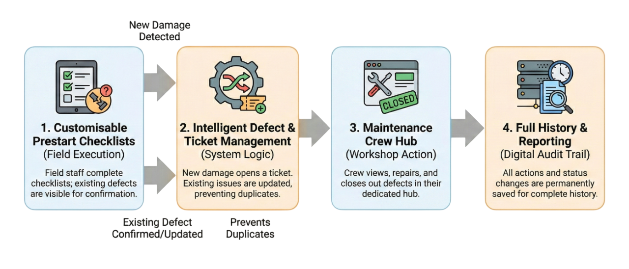 When an operator creates a defect, it opens a ticket in the Workshop Hub. Mechanics can track parts, labour, and status, ensuring the machine doesn't go back to site until it's safe.