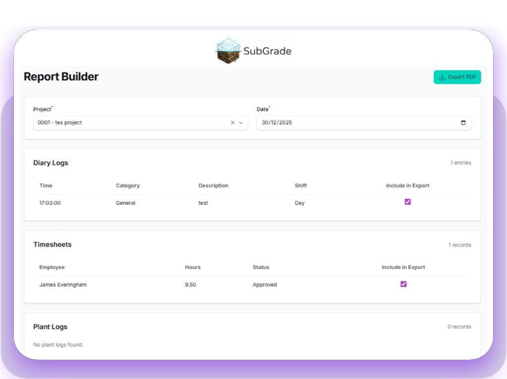 Absolutely. The Report Builder lets you choose exactly what data to include: crew hours, plant allocations, weather conditions, quantities, site photos—whatever your project or client needs. Save templates for recurring reports or build custom one-offs as required.