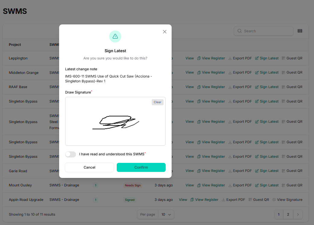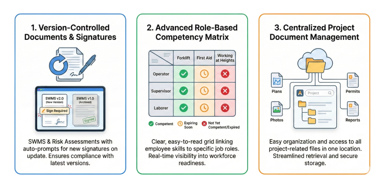 Upload your SWMS, Plant Risk Assessments, and policies once. When you release a new version, the system automatically archives the old one and ensures your crews are only ever viewing—and signing—the latest approved document.