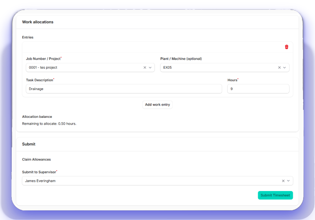 Timesheets capture labour + machine hours with crew-specific rules, allowance logic, and supervisor approvals built in—no more chasing scribbles or missing signatures.