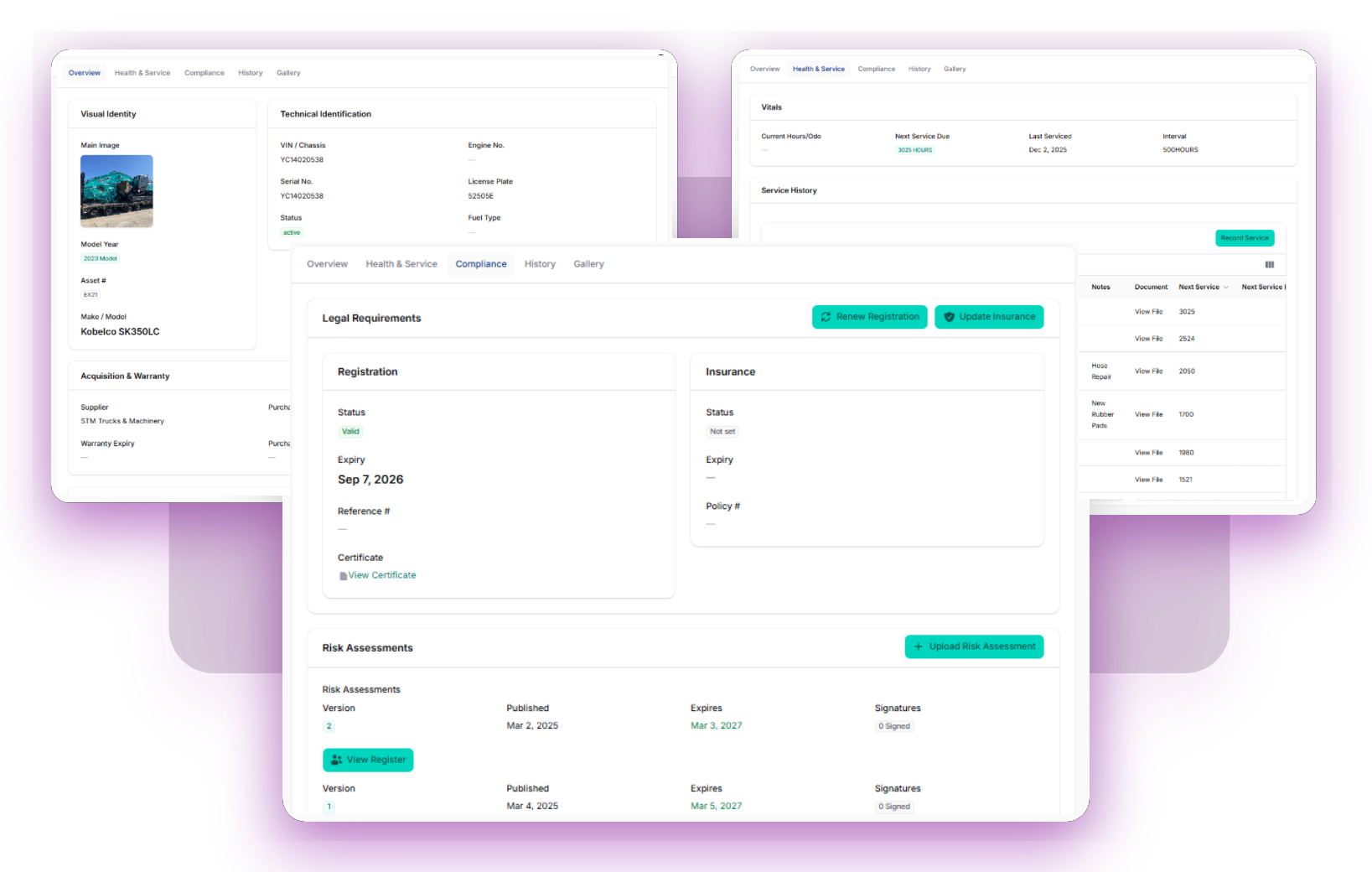 Set service intervals (e.g., every 250 hours). The system reads live hour-meter data from daily prestarts and alerts your workshop when a machine is due. No more spreadsheets or missed oil changes.